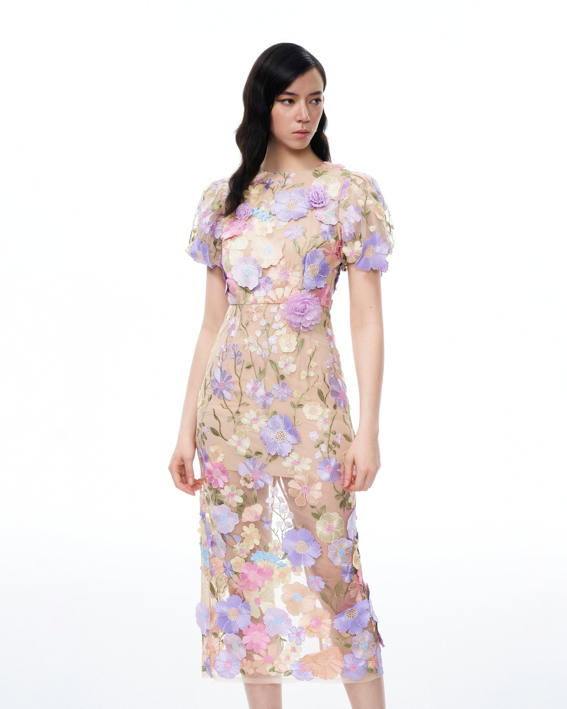 Alaric Round Neck 3D Floral Embroidered Maxi Dress - Pastel Multi