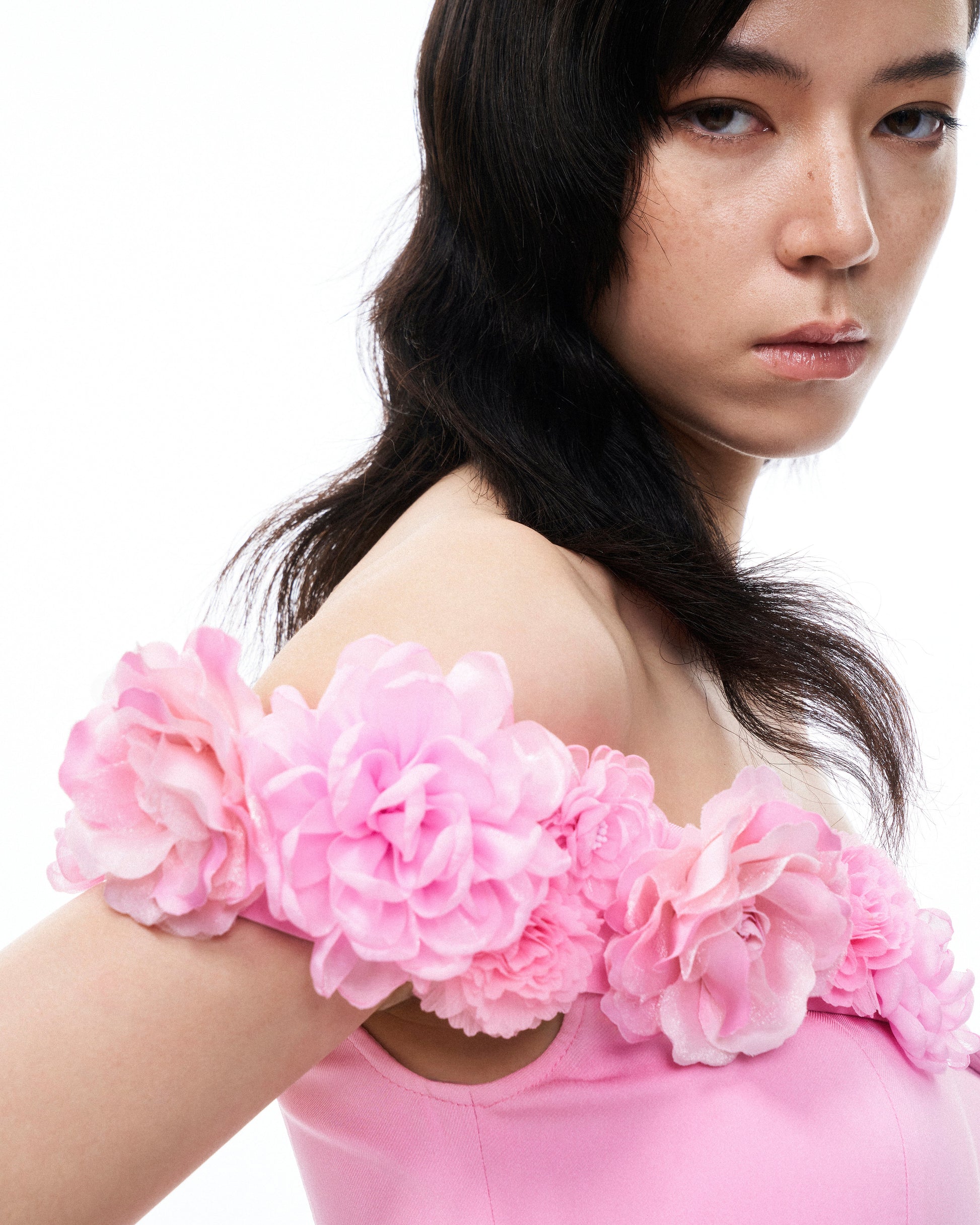 Aurelius Wrap-Around Shoulder 3D Floral Mini Dress - Pink
