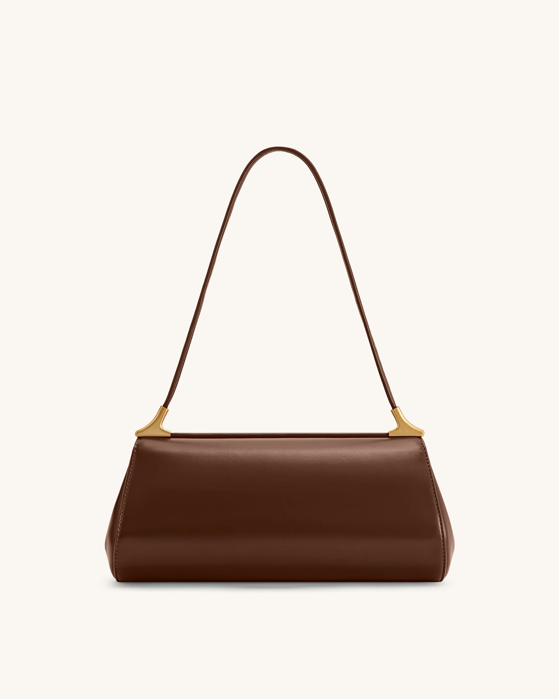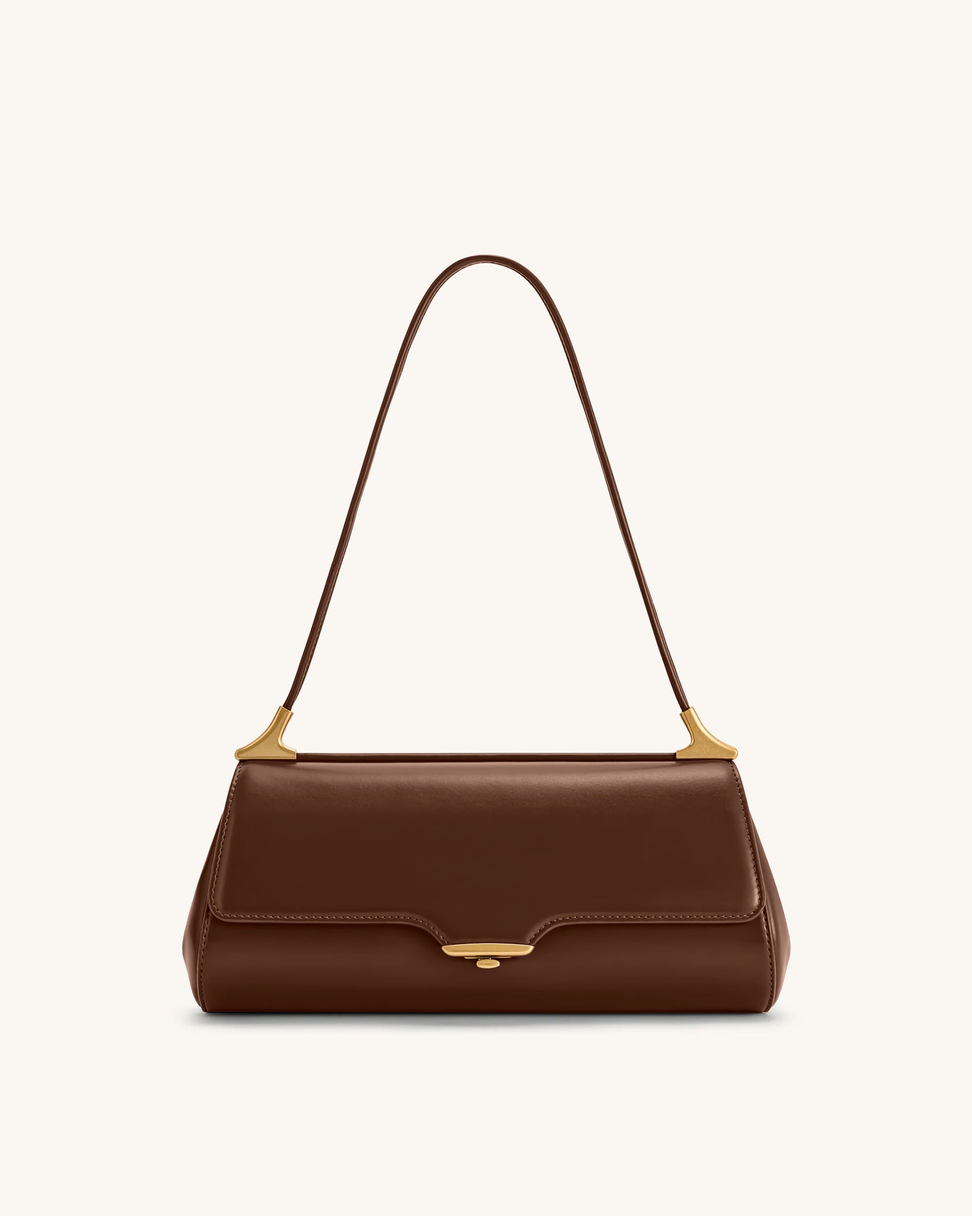 Elegant brown shoulder bag with sleek structure. Golden hardware accents add a sophisticated touch. Perfect for essentials and daily use.