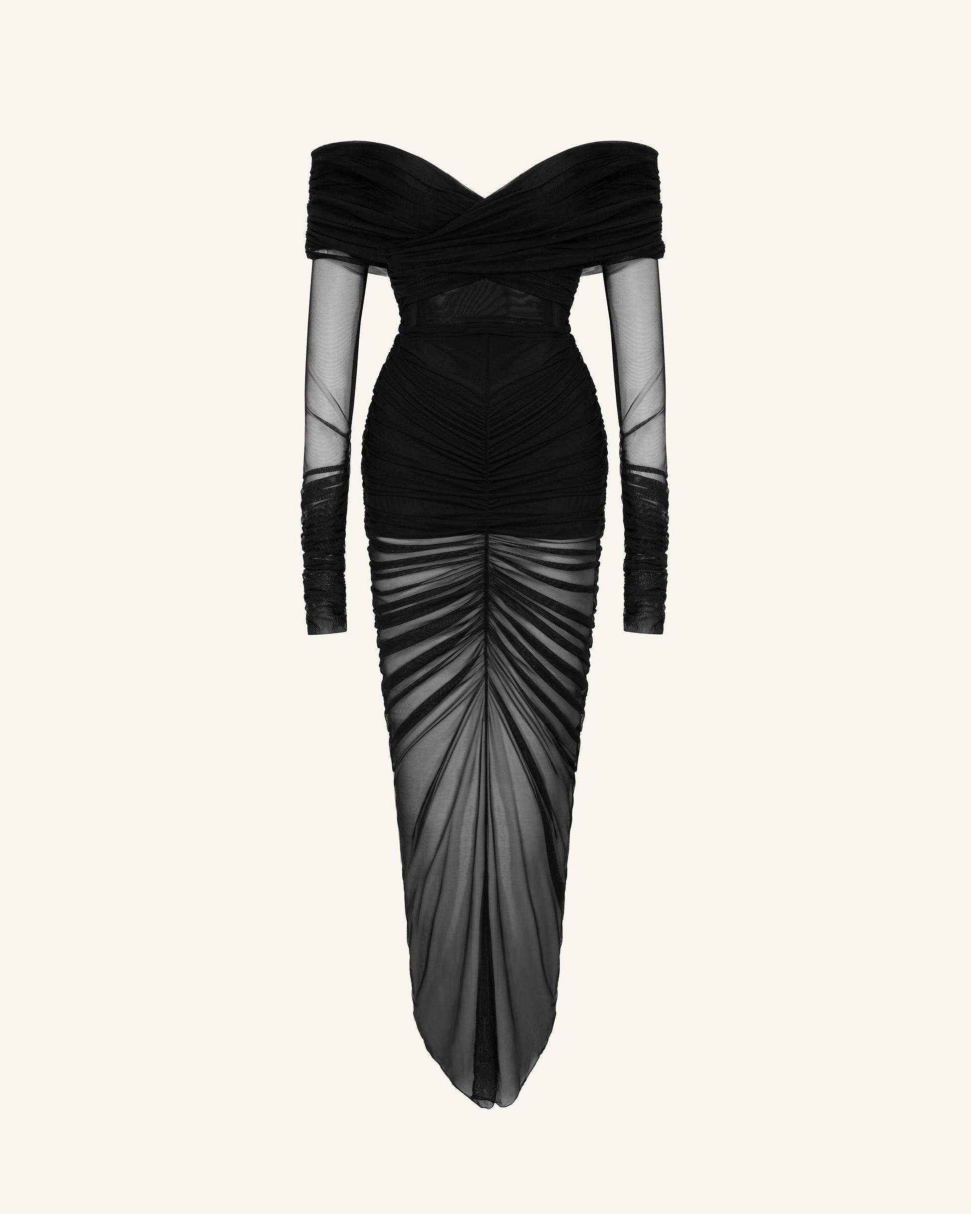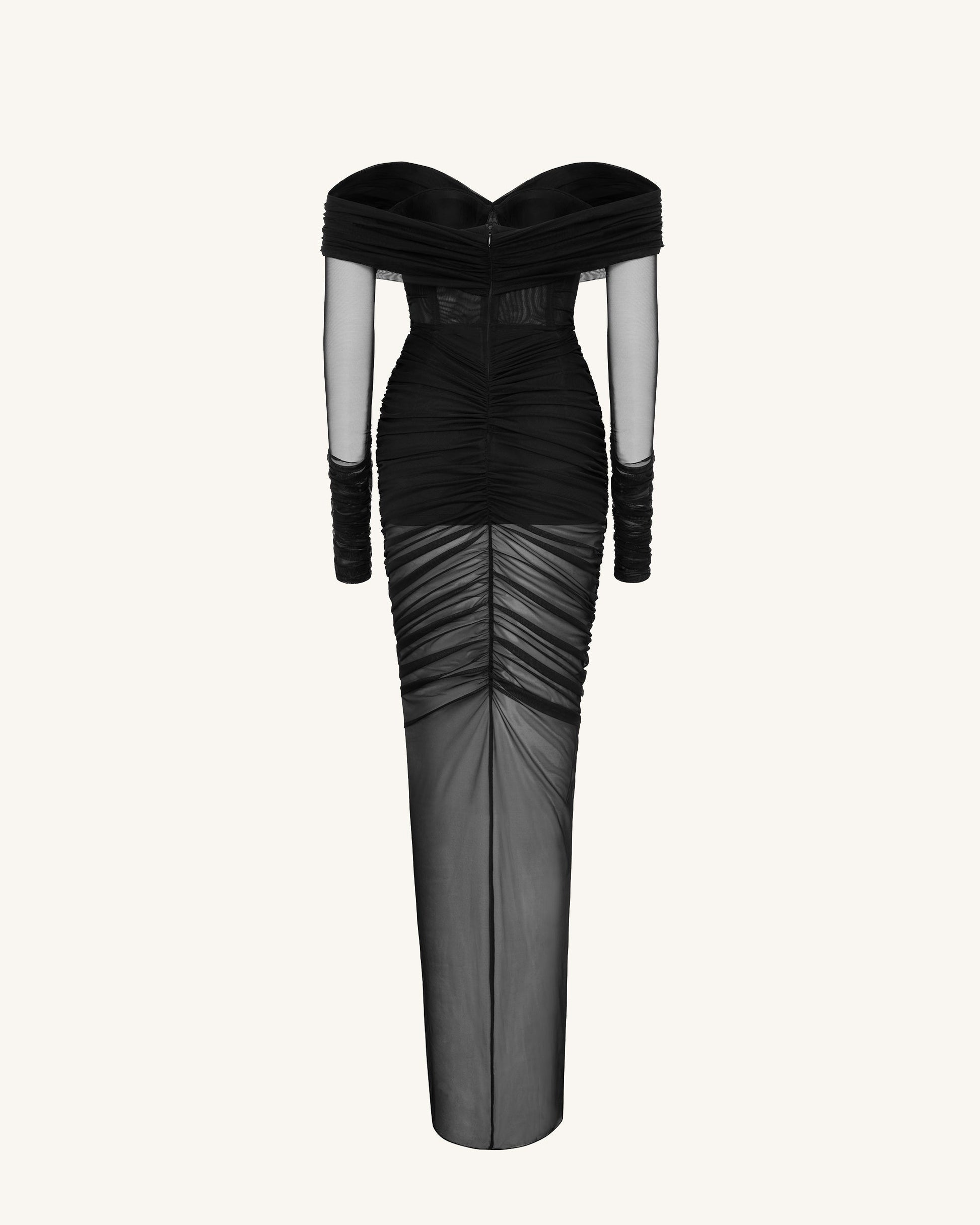 Emily Elegant Off-Shoulder Ruched Gown - Black