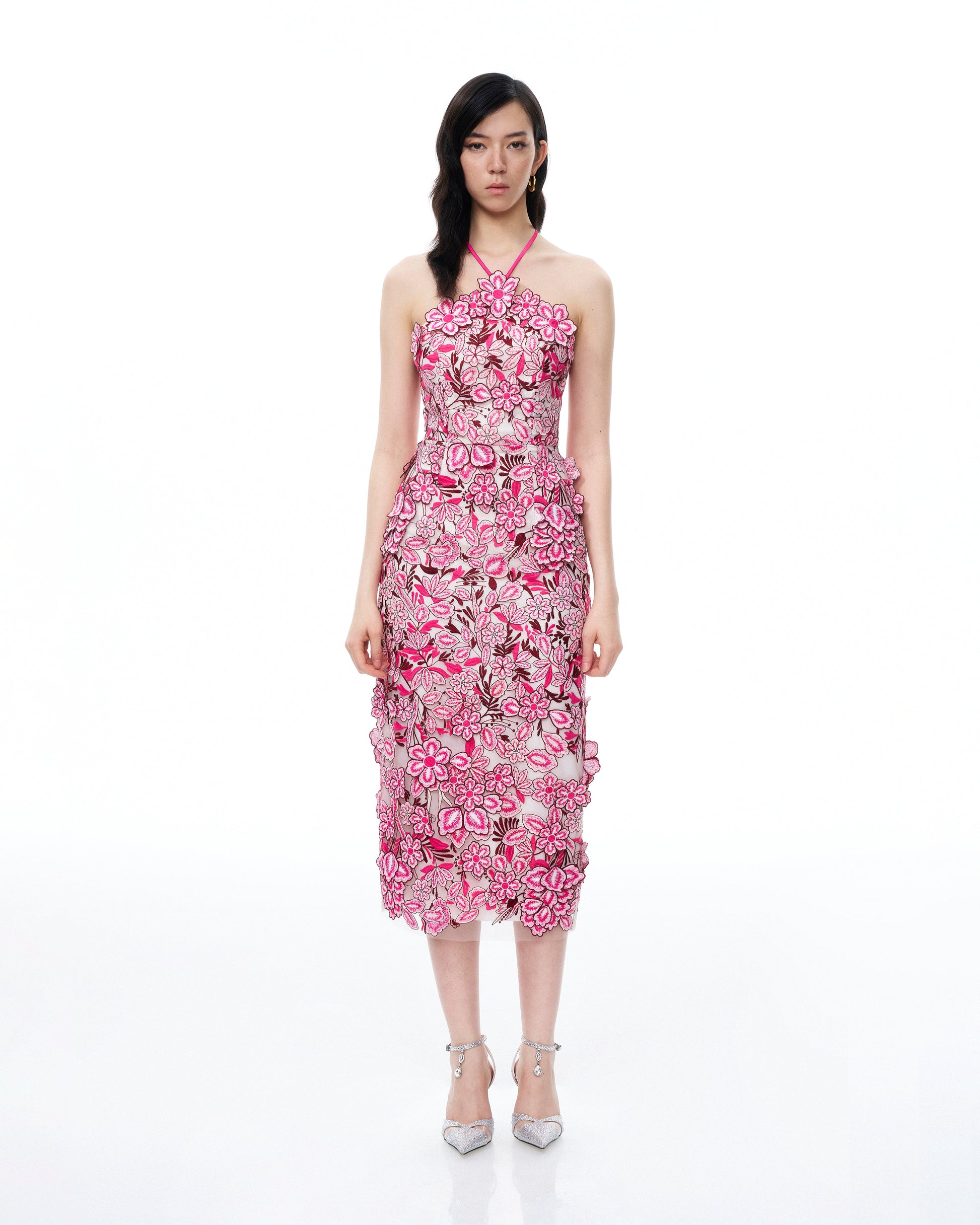 Fiora Halter Neck Floral Embroidered Maxi Dress - Rose Red