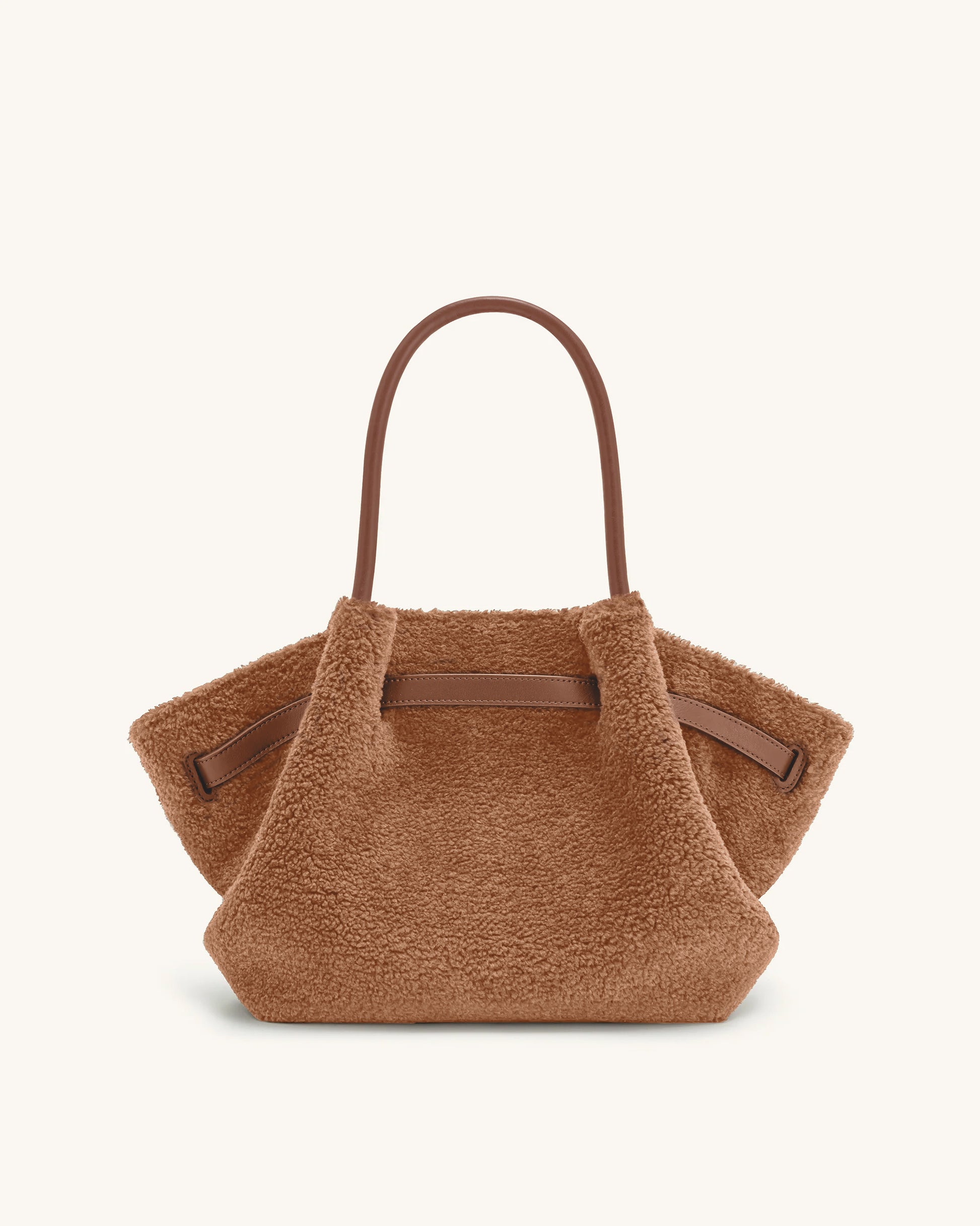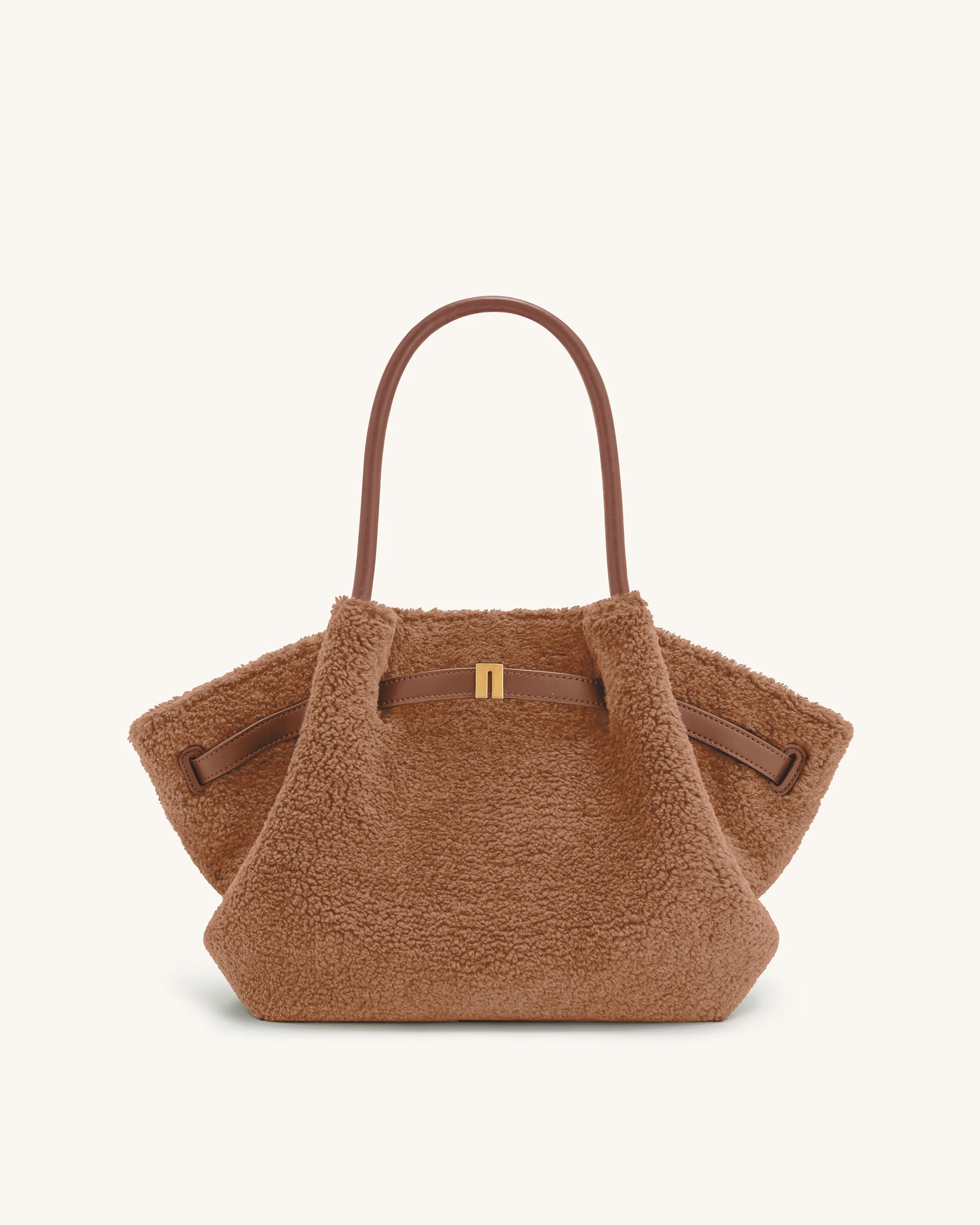 This cozy trapezoid tote bag in coffee brown features a plush shearling-like texture and a soft yet structured silhouette. Designed with elongated handles and a roomy interior, it blends warmth and style—making it the perfect accessory for cold-weather seasons.