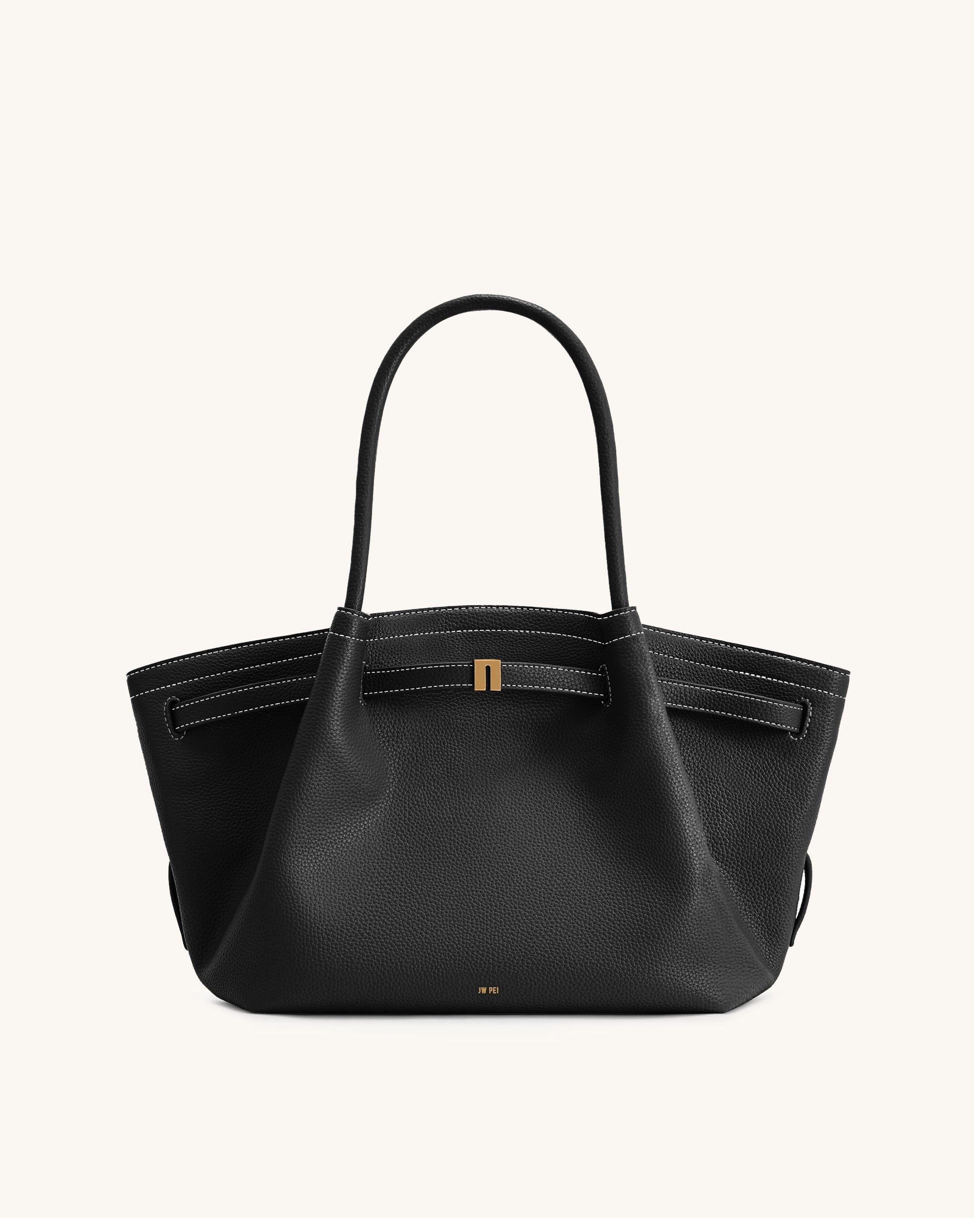 This structured trapezoid tote bag in classic black features a refined pebbled texture and contrast white stitching. Designed with long handles and a soft yet sculptural silhouette, it offers both elegance and capacity—perfect for work, errands, or city outings.