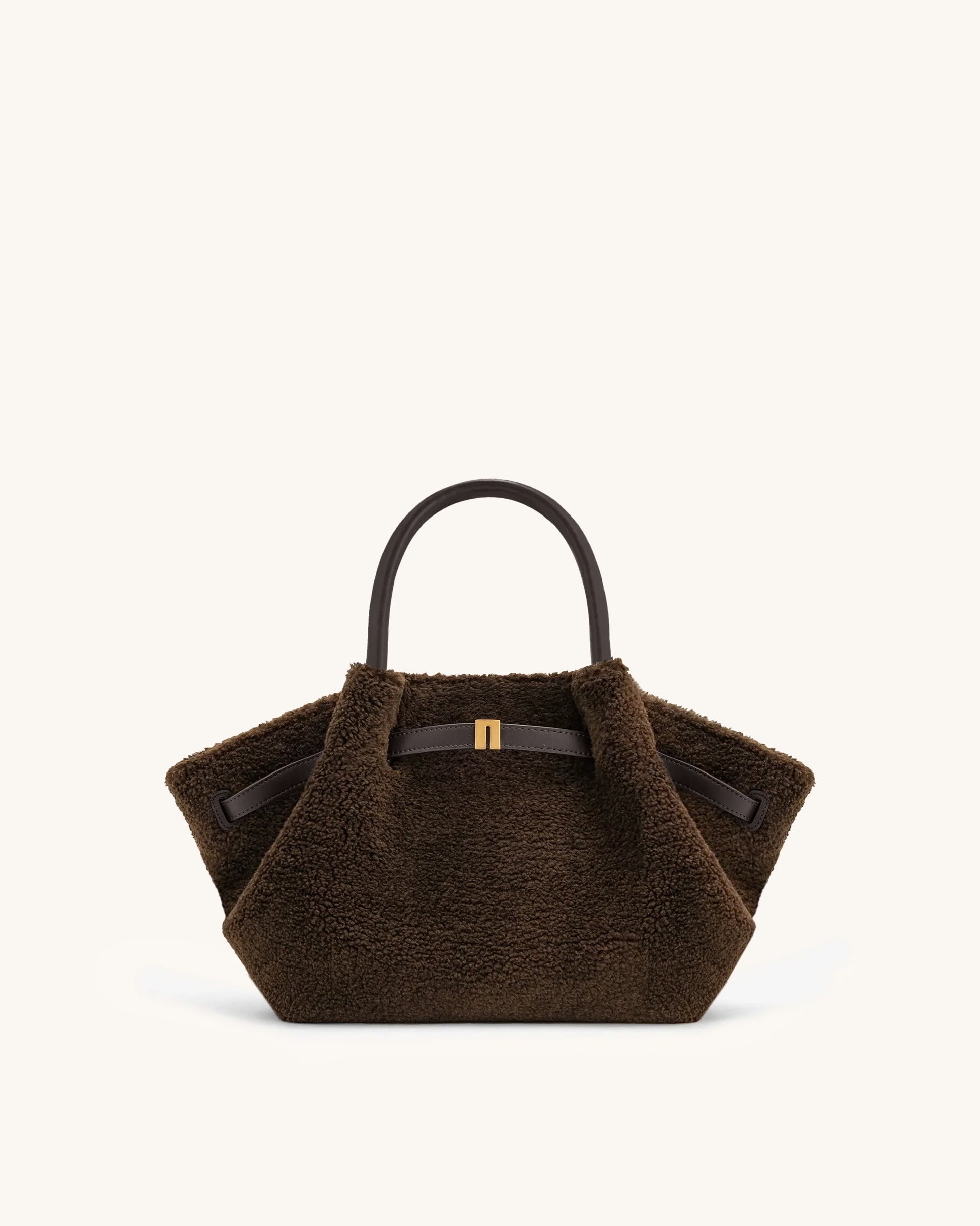 This cozy tote bag features a sculptural trapezoid silhouette in plush dark brown shearling texture. Accented with sleek leather-look handles and a gold-tone detail, it's the perfect cold-weather companion that adds warmth and style to your everyday outfits.