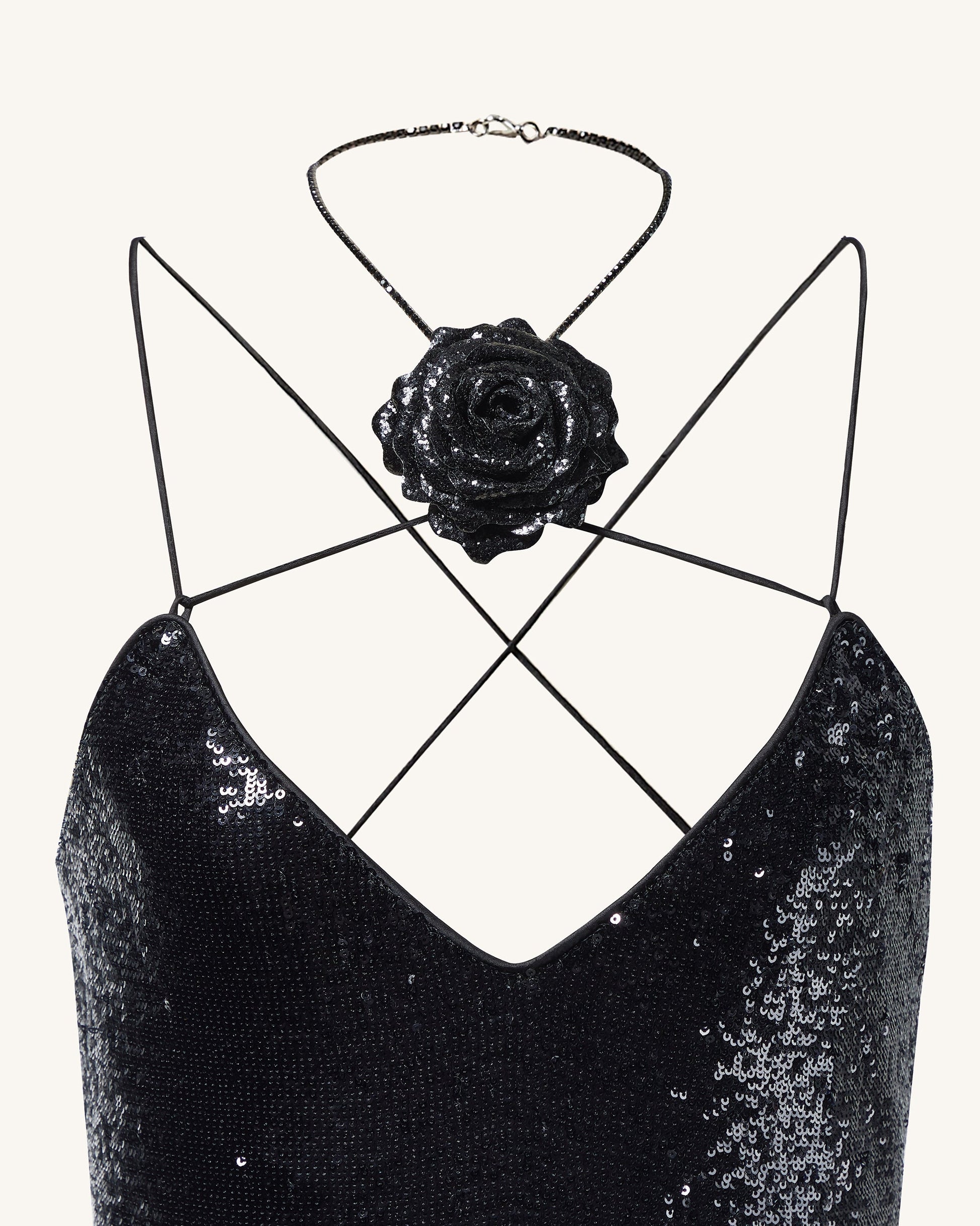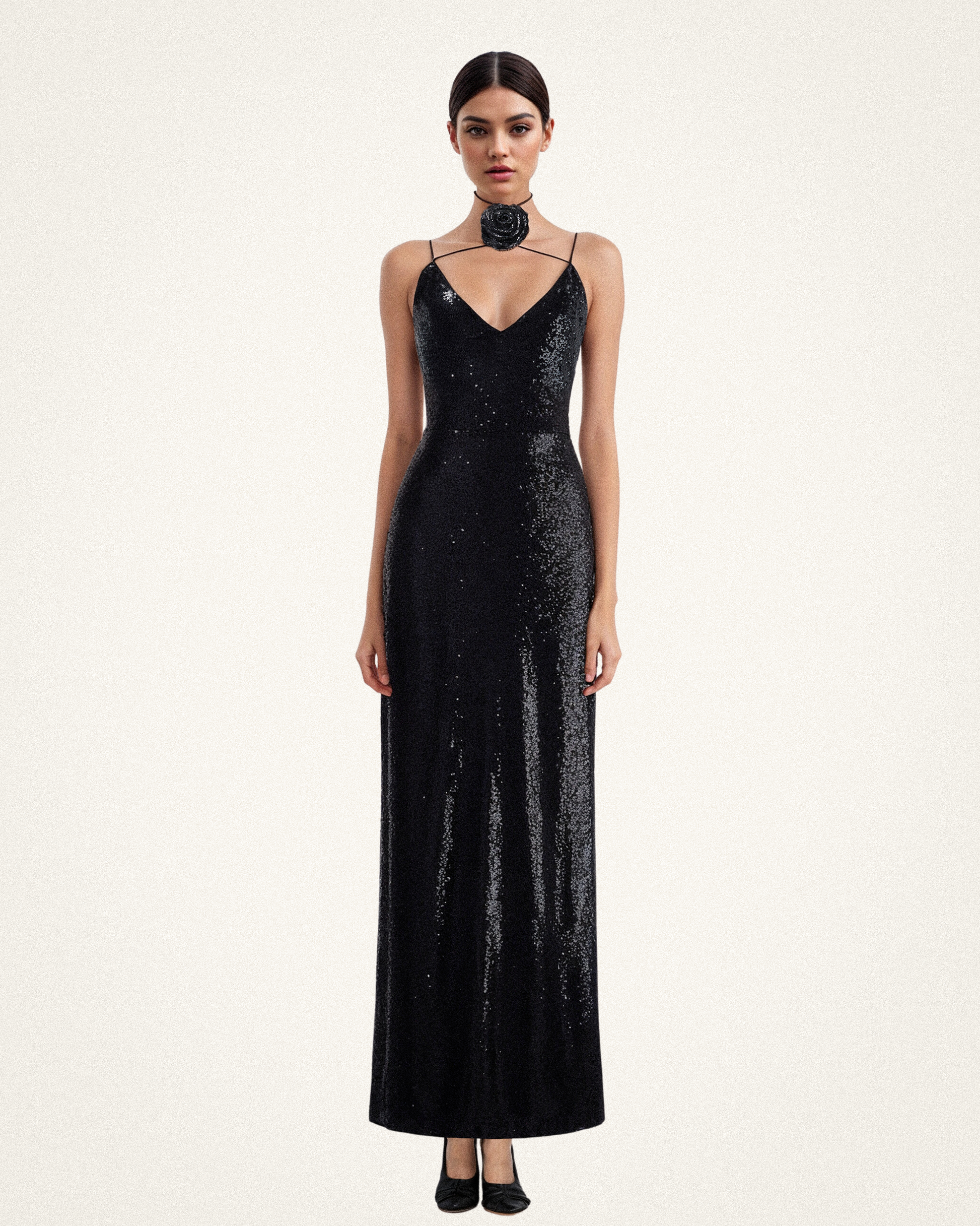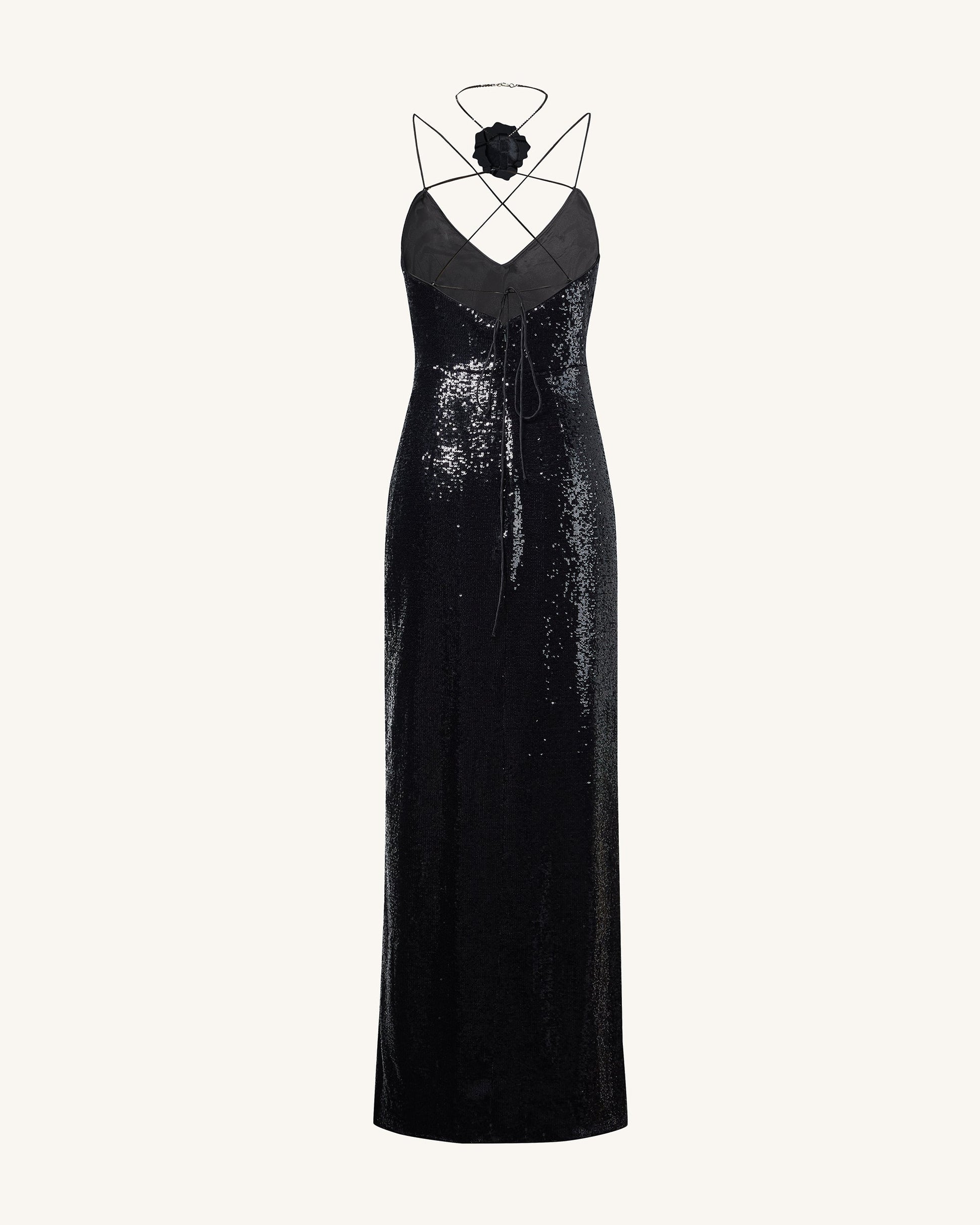 Heisey Black Sequinned Rosette Maxi Dress - Black