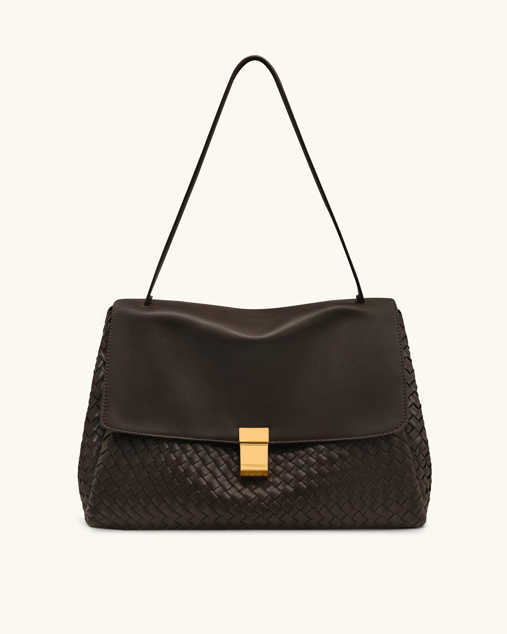 This sophisticated shoulder bag is crafted with a smooth faux leather flap and a woven base in a deep espresso hue. Accented with a gold-tone clasp and a minimalist strap, it delivers timeless elegance and everyday functionality.