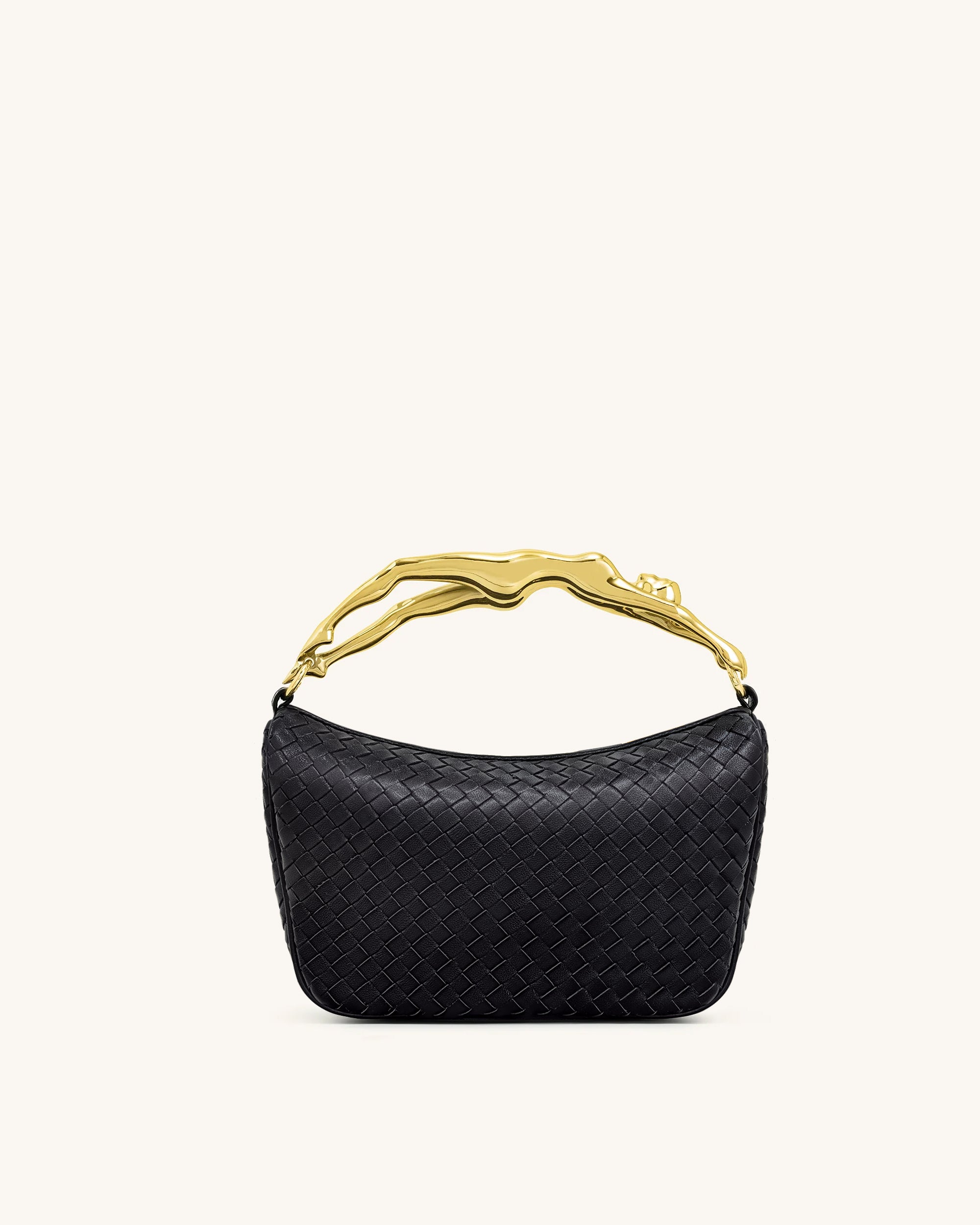 This handbag features a sculptural gold-tone metal handle in the shape of a reclining human figure, paired with a sleek jet black woven body. Its compact silhouette and refined details combine artistic flair with modern sophistication, making it a striking accessory for any occasion.