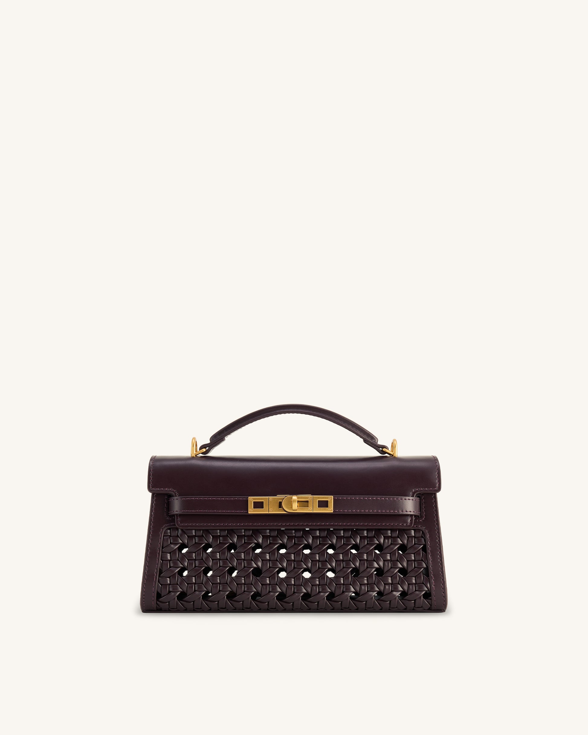 Structured and modern woven vegan leather bag. Rich brown tone with gold hardware adds elegance. Compact yet practical for essentials. Top handle and adjustable strap for versatile carry.