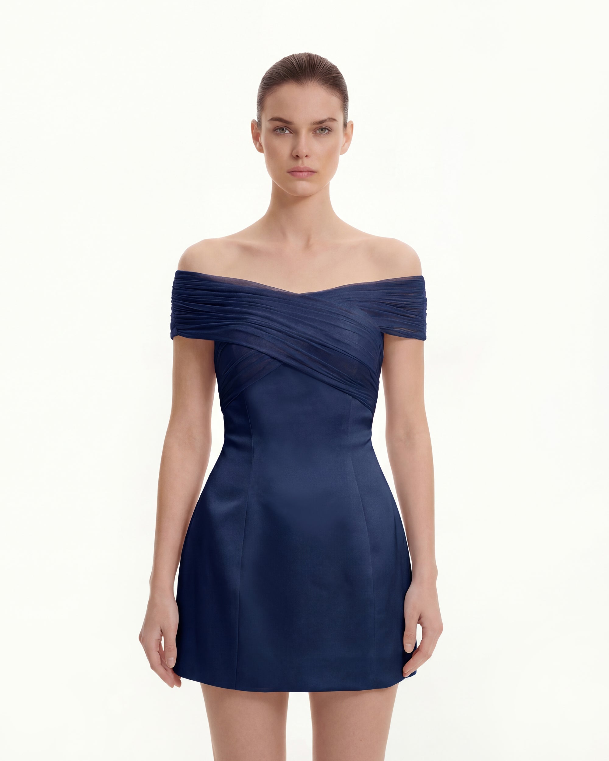 Satin Mini Dress with Tulle Cross-Halter - Navy blue