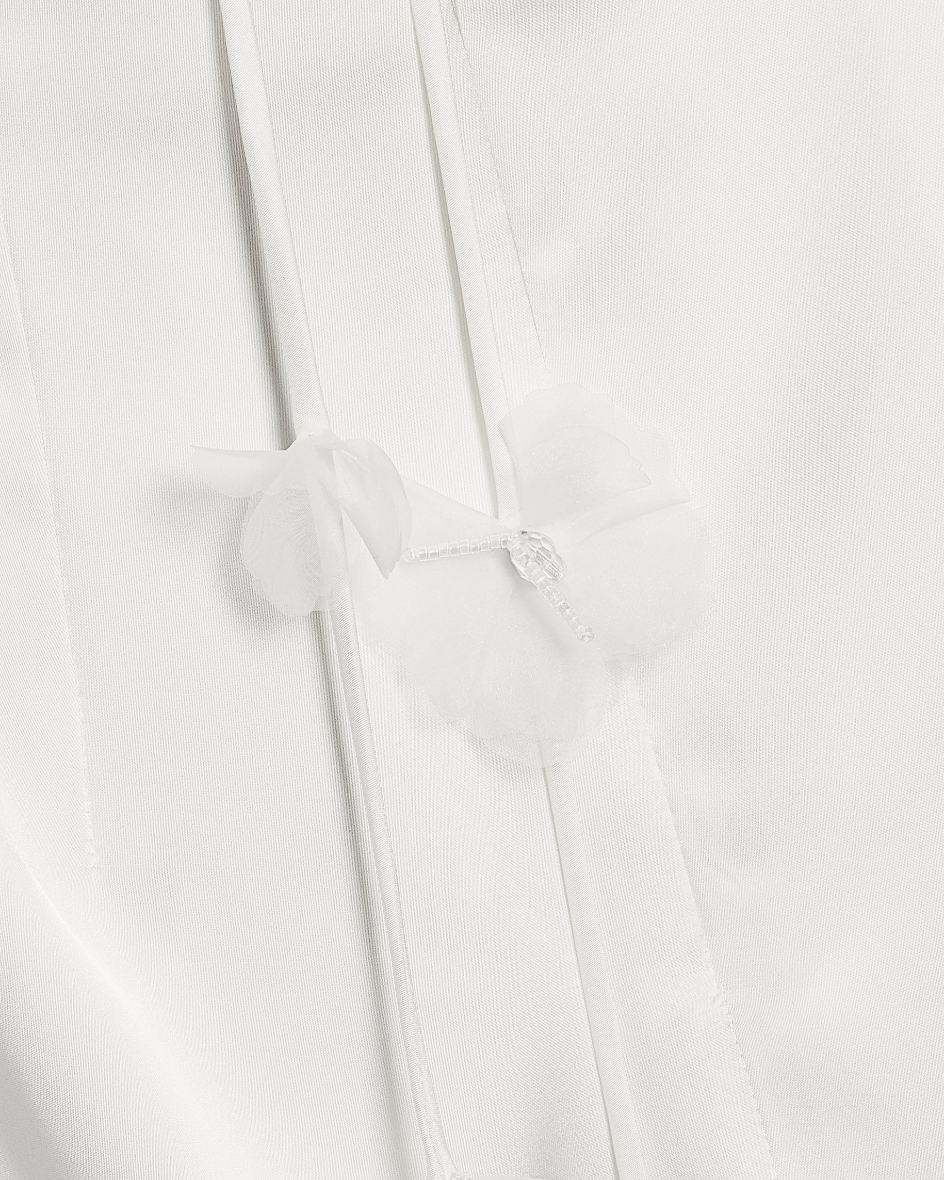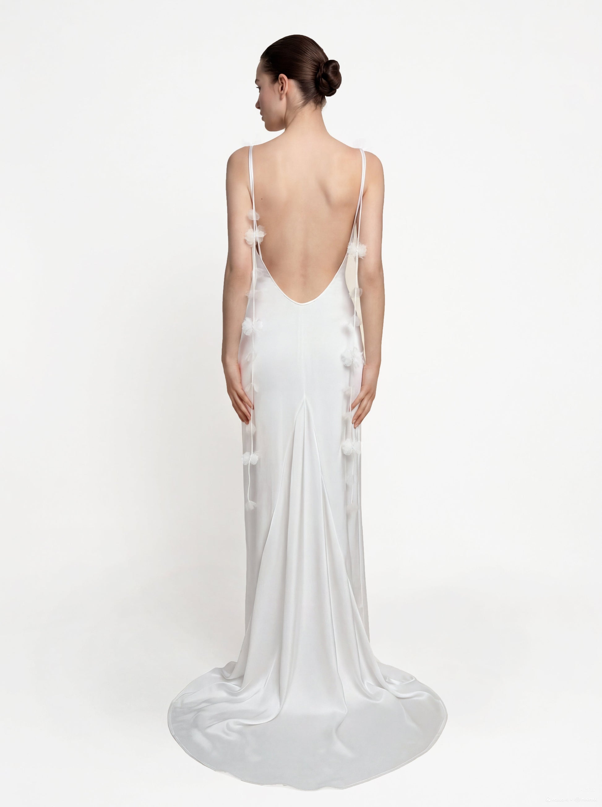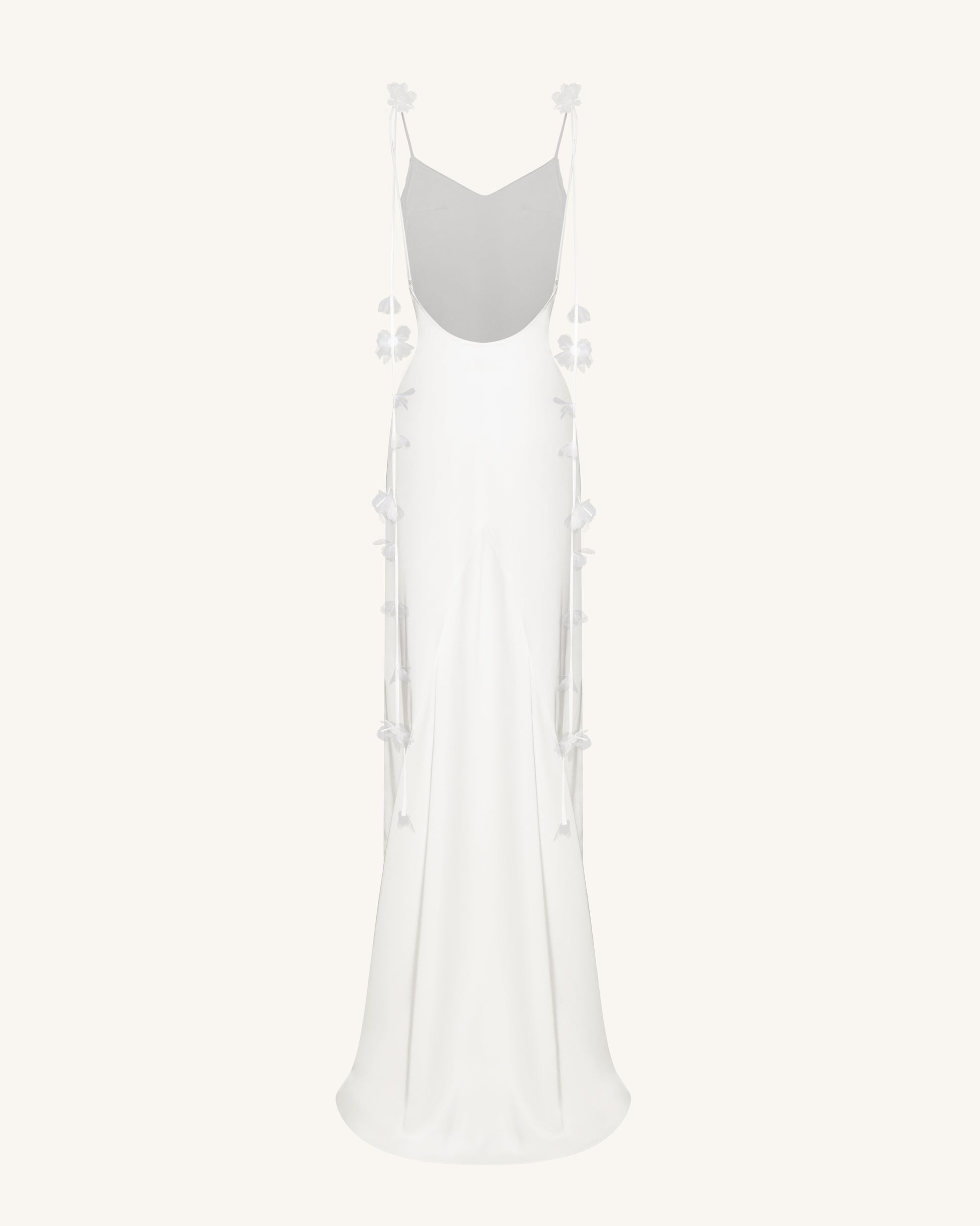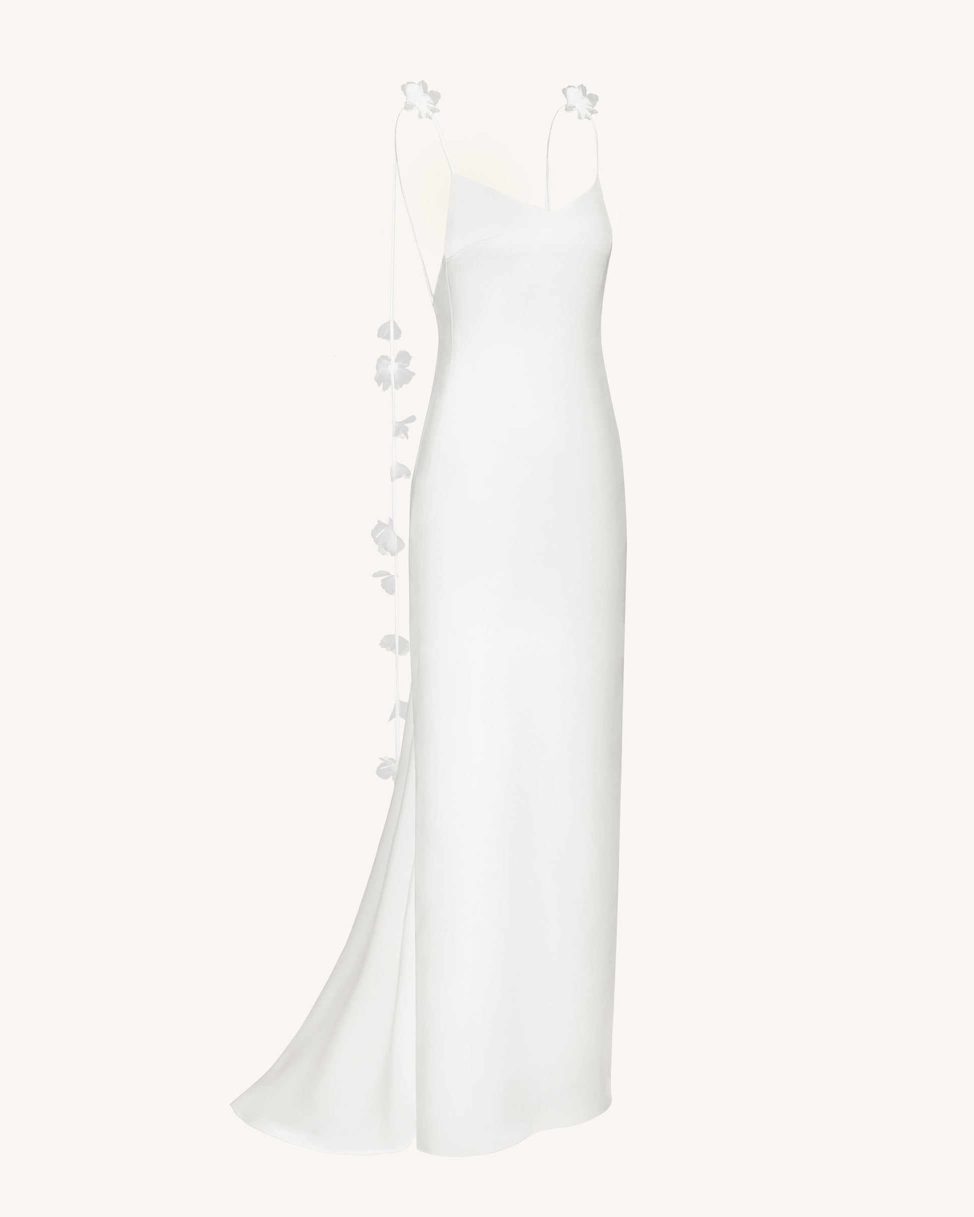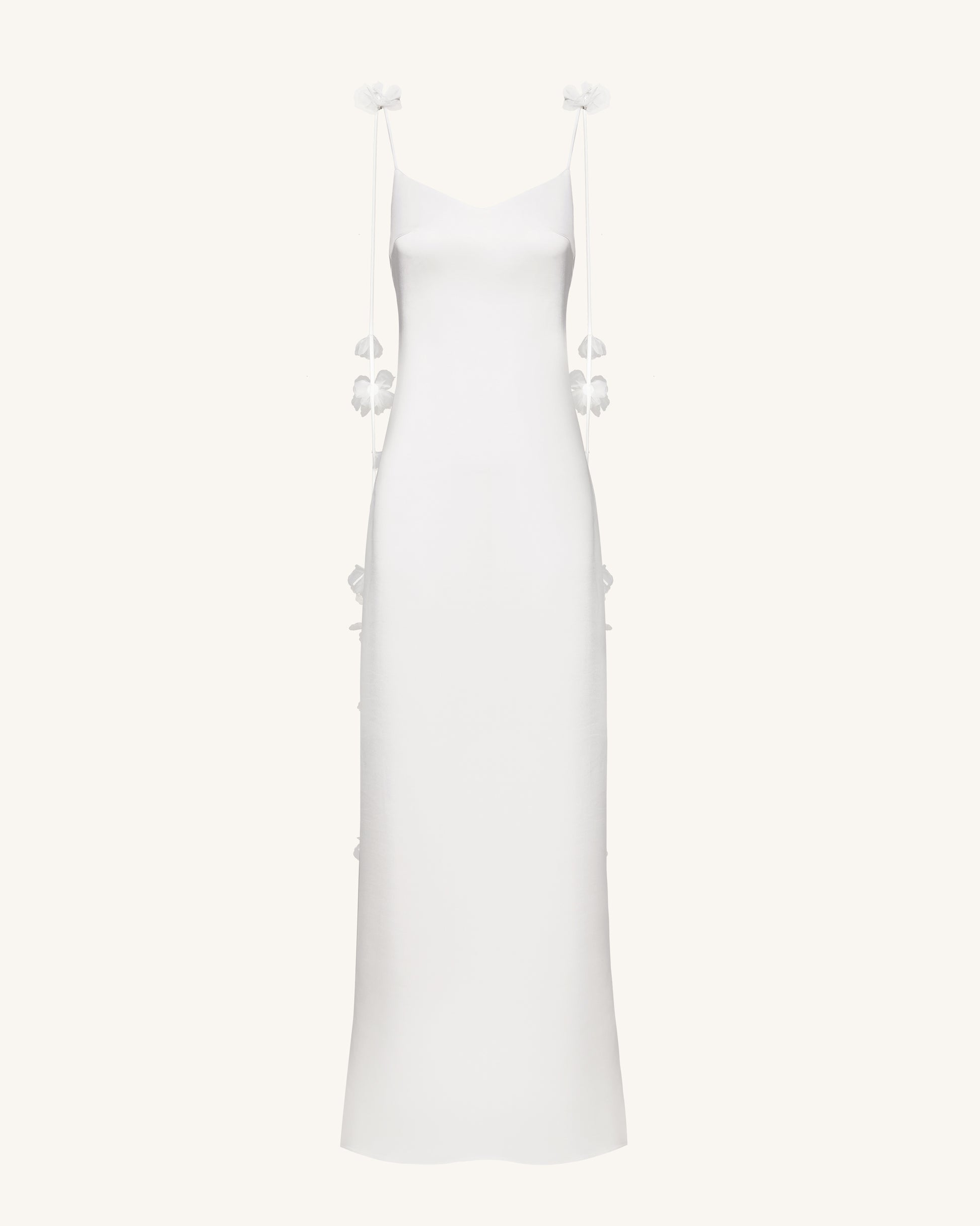 Satin Strappy Maxi Dress with Floral Streamers - White