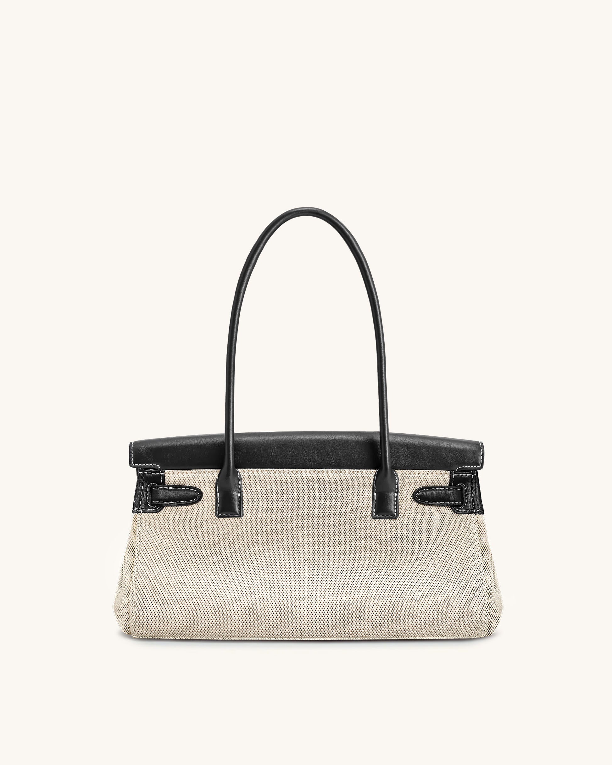 Chic and structured canvas and vegan leather top handle bag. Contrasting black and beige tones with golden hardware offer timeless style. Spacious enough for daily essentials and secure with a twist lock closure.